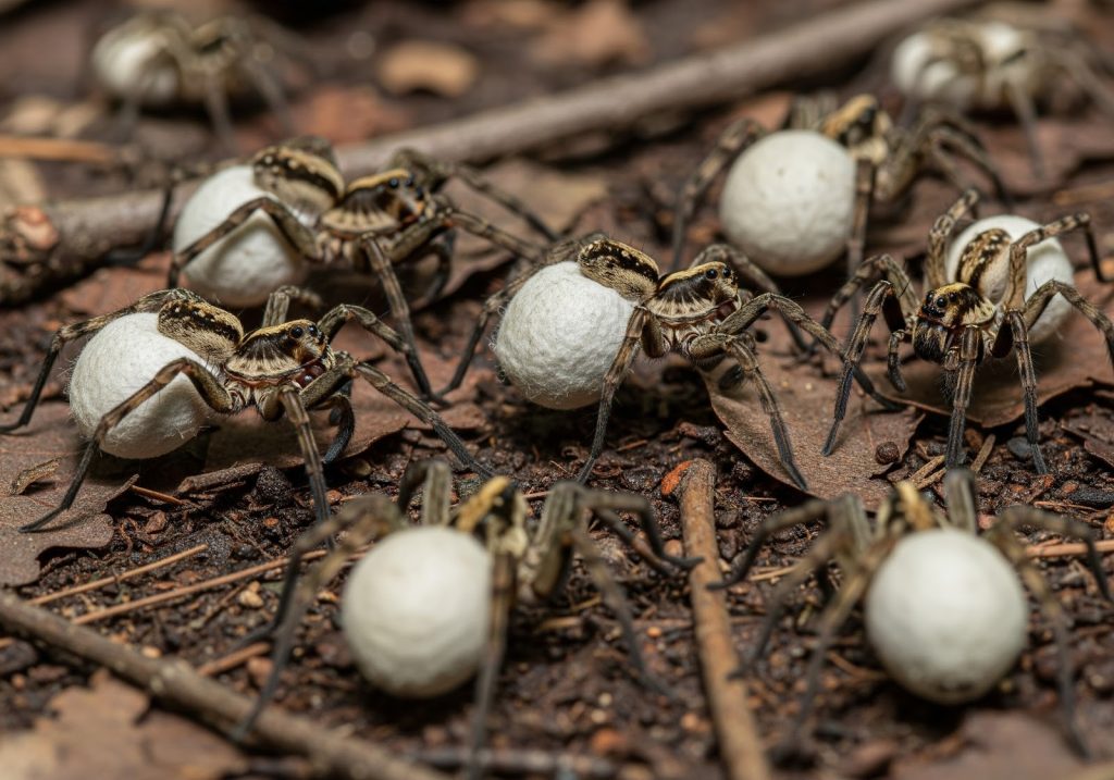 • Aranhas-Lobo (Lycosa e gêneros relacionados): Aranhas robustas, frequentemente encontradas no chão, carregando seus ovos ou filhotes.