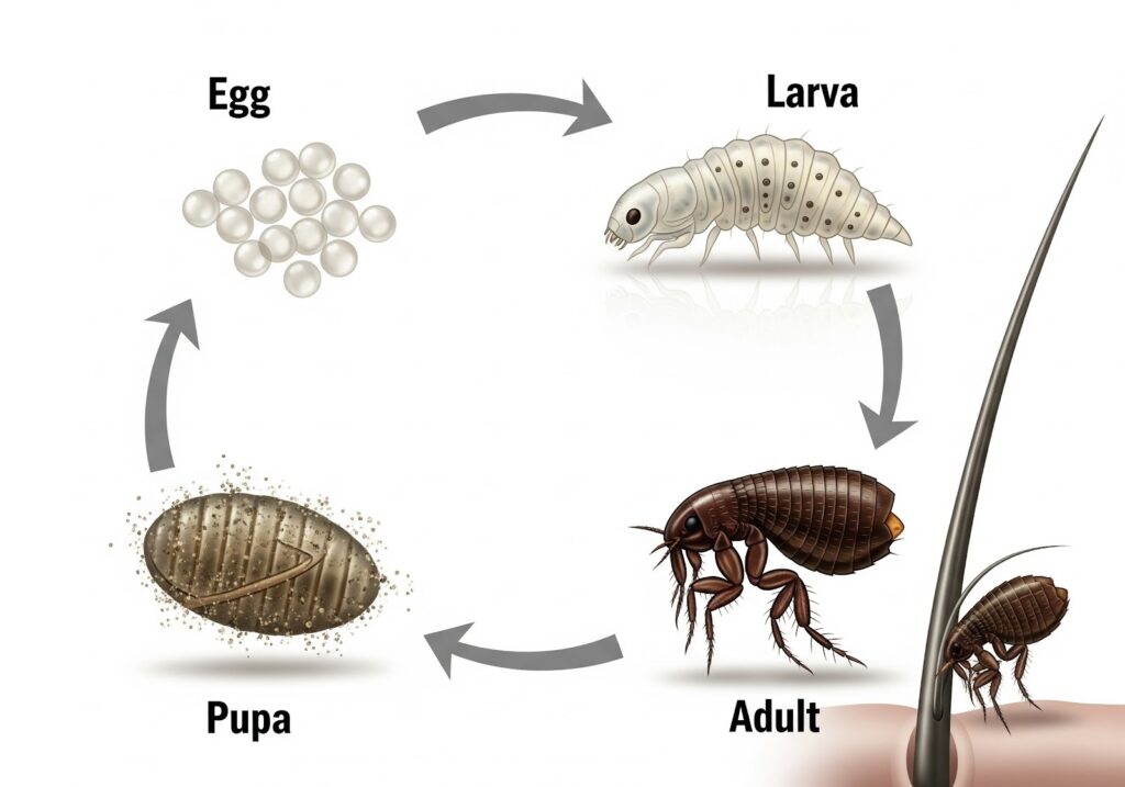 O ciclo de vida de uma pulga passa por quatro estágios: ovo, larva, pupa e adulto.