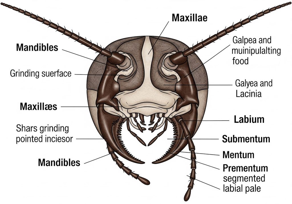 - Mandíbulas: São estruturas fortes e serrilhadas que se movem lateralmente para cortar e esmagar o alimento. Elas são a principal ferramenta usada pela barata para se alimentar de praticamente qualquer coisa.